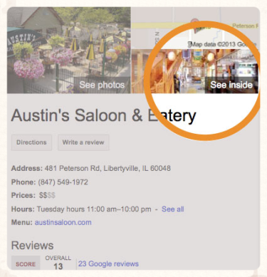 Add a virtual tour of your busness and increase your organic search results. Google users can see inside your business on Google Search, Google Maps, and Google+Local!